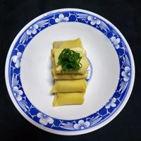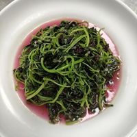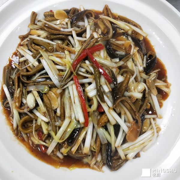 此菜灵感来自响油鳝丝,减少油,糖等添加蒜黄,口感清新爽口。
