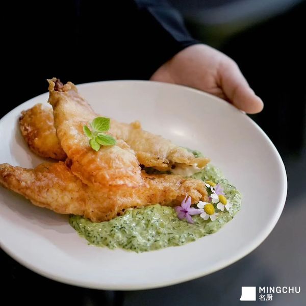 【食材特点】选用新鲜白肉鱼,肉质细嫩刺少,裹以薄脆面糊轻炸,外酥内润;搭配青酱由香草、坚果与酸奶调制,清新解腻;点缀可食用小花与薄荷叶,增添自然风味与视觉层次,凸显食材本真与季节感。