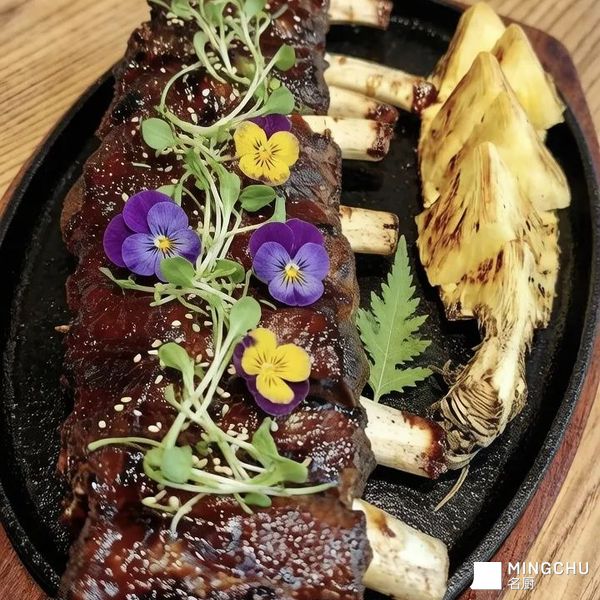 成品色泽诱人,肋排外皮微焦锁汁,内里软嫩多汁,脂肪融化后带来绵密脂香,黑猪特有的坚果香气在咀嚼中迸发;搭配的配菜(如烤物、鲜蔬)平衡油腻,整体风味层次丰富,口感柔滑与焦香交织,是味觉与质感兼具的精致料理。