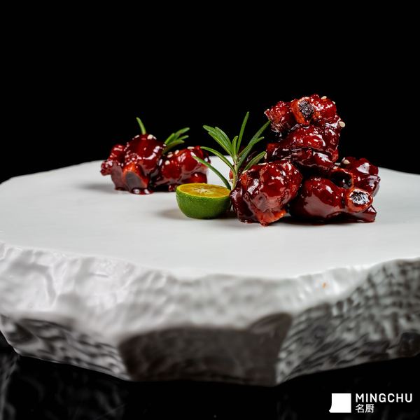 外观品相:采用传统炒糖色技法收汁,成品呈现油润通透的琥珀红亮光泽,每一块排骨都均匀挂着浓稠拉丝的酱汁,搭配清新香草、青柠点缀,精致适配菜品摆盘。