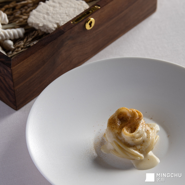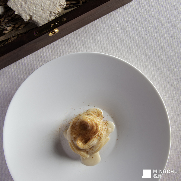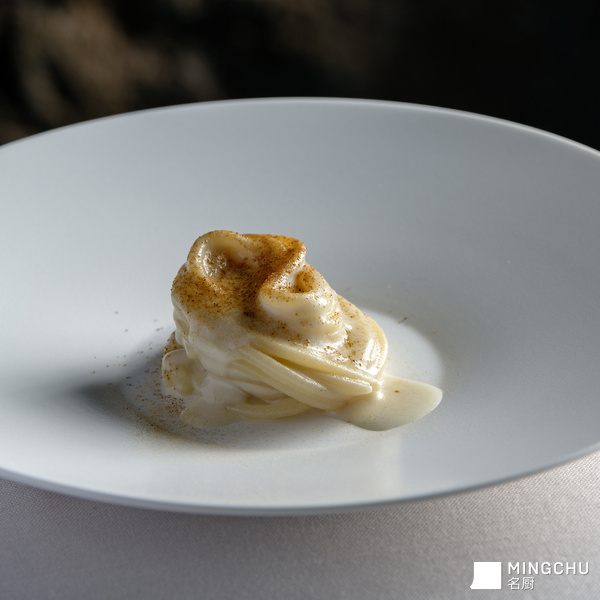 这是一道关于发酵与鲜味的大胆探索。灵感来自日本传统米麴(Koji)的工艺,我以意大利面为载体,将米麴上发酵的酶转到意面上将其重新进行二次发酵,在小麦本身的甘甜中提炼出天然的鲜味。众所周知,味精的本源正是小麦。通过发酵与提纯,意大利面中的谷物纤维释放出更为深邃的鲜味与旨味,令熟悉的面条焕发出全新的表现力。