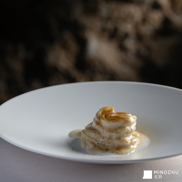 借鉴“米麴”古法,让螺旋面蜕变为独具韵味的“面麴”。酱汁自带微醺的酵香,缠绕于根根分明的圆细意面上,入口时既有谷物的醇厚,又有发酵带来的清爽回甘,并融入甜杏仁的温润。焦糖洋葱的甜美粉末,仿佛暖阳般为这道菜镀上柔光。