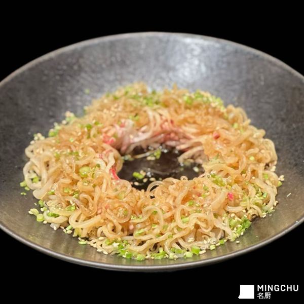 这是一道结合四川本地食材与江南葱油技法的清爽凉菜,用红皮萝卜丝+海蜇丝双脆组合,口感层次丰富,萝卜清甜解腻,海蜇脆嫩弹牙,葱油香气浓郁,咸鲜适口,是宴客或下酒的绝佳前菜。