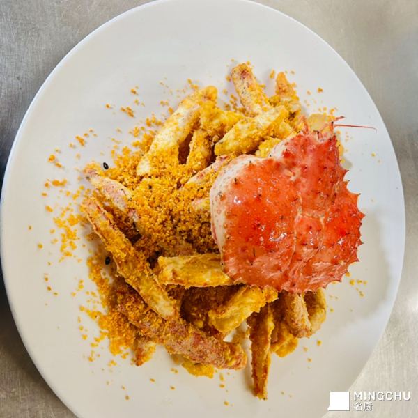经典的港式海鲜料理——避风塘炒帝王蟹,以鲜活帝王蟹为主料,蟹壳鲜红带刺,蟹腿与蟹身均匀裹满金黄酥脆的避风塘料,蒜香、面包糠焦香与蟹肉鲜甜完美融合,口感外酥里嫩、咸香浓郁,是高端宴席与餐厅的热门菜品。