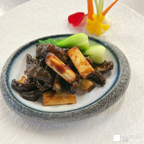 葱烧海参,鲁菜经典以深海海参为主料,入葱白慢煨收汁。海参软糯不碎,葱香醇厚去腥,红亮油润、咸鲜回甘,一口尽显高端宴席格调。