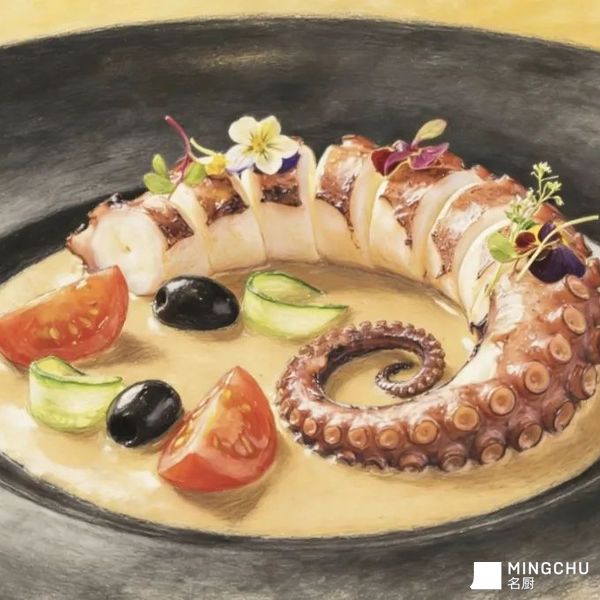八爪鱼须取其弹嫩紧致的本味,以香茅轻腌、高温快烤,仅赋予表层淡淡的烟火气息与草本清香,最大程度保留海鲜本身的鲜甜与脆嫩口感。蒜香黄椒泥辣酱是整道菜的灵魂基底:黄灯椒的柔和甜辣、红萝卜的自然回甘,与蒜肉、干葱经牛油慢炒出的醇厚香气相融,再以鱼露提鲜、青柠提酸、Tabasco增添利落辛香。熬煮打泥后,加入圣女果、酸青瓜与黑水榄丰富层次,最后以淡奶油柔化辣度与锋芒,使酱汁绵密如膏,酸、辣、鲜、香层层递进。