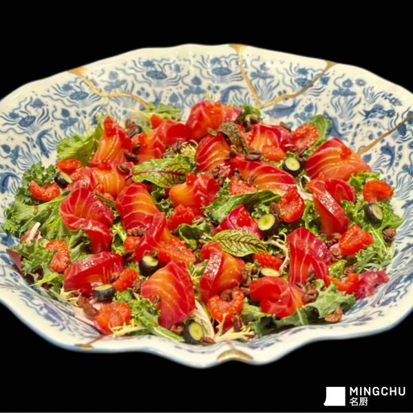 这道沙拉是生食海鲜与清新蔬果的经典碰撞,核心在于平衡风味与口感:三文鱼的丰腴油脂需要树莓的酸甜来中和,脆嫩蔬菜与坚果碎则提供了丰富的咀嚼层次,薄荷叶的清凉香气能进一步提升清爽感,让整道菜吃起来轻盈不腻。摆盘时要注意色彩分布,红(三文鱼、树莓)、绿(蔬菜、薄荷叶)、棕(坚果)、黑(橄榄)错落开,视觉上会更精致诱人。