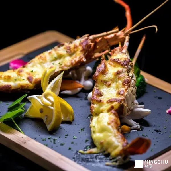 精选鲜活小青龙对半剖开,以马苏里拉芝士融合芥末、柠檬与黄油秘制焗酱,高温焗至表层焦香流金。虾肉在芝士的绵密包裹中锁住鲜甜,柠檬的清酸与芥末的微辛恰好解腻,搭配当季时蔬,鲜醇与清爽交织,是宴客桌上的点睛之味。