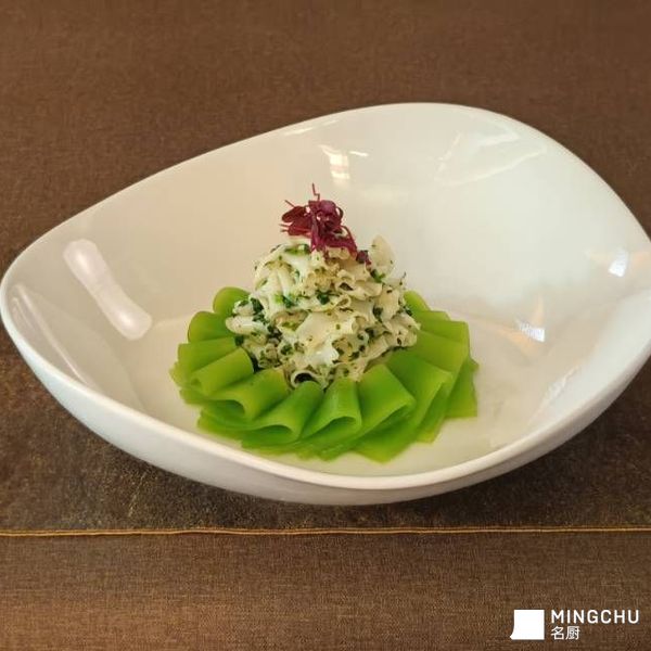 春季时令食材为核心,将青笋的脆、绣球菌的弹、香椿的香完美融合,是典型的“清鲜为本”的新派凉菜。香椿的独特辛香与绣球菌的菌香相互映衬,搭配青笋的清甜,层次丰富而不腻。翠绿的青笋与洁白的绣球菌形成鲜明对比,顶部的红色苗菜点缀,让整道菜充满春天气息,摆盘精致,极具高级感。适合作为高端商务宴请的前菜,或春季菜单的特色凉菜,既体现时令感,又能展现厨师的刀工与审美。