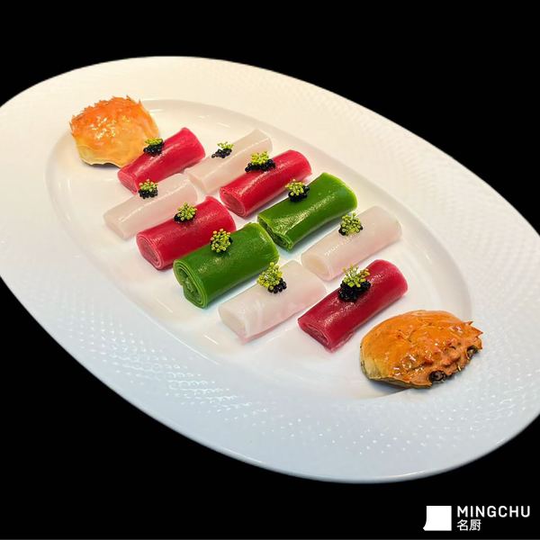 这是出自味蕾青年烹饪团队彭杰的一道精致创意原创融合菜,以蟹粉为核心,用天然食材调色的薄皮卷制而成,视觉与风味兼具。凉皮比例我放评论区了,需要的自取。