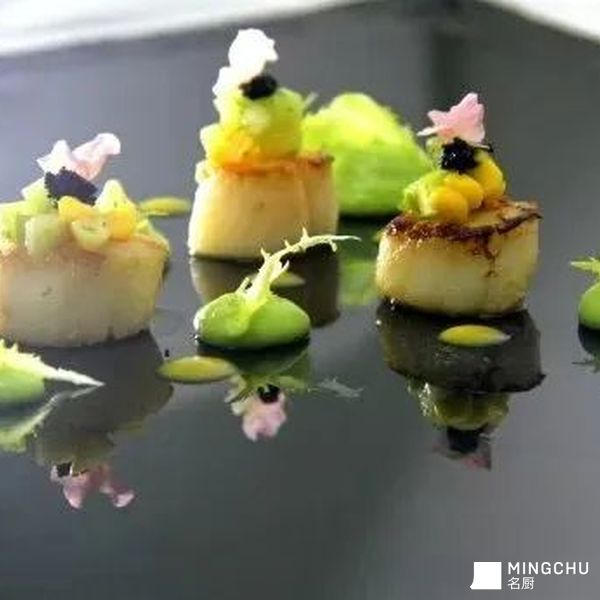 鲜活澳带以铁板香煎,边缘微焦如金,内里柔润似玉,锁住海洋的鲜甜。绵密如丝的青豆泥化作春日翡翠,托举着颗颗黑鱼子——舌尖轻抿,咸鲜迸发,与豆香、贝甜层层交融。盘间繁花与倒影相映,是法式精致与意式清新的完美邂逅,每一口都是味蕾的高级礼遇。