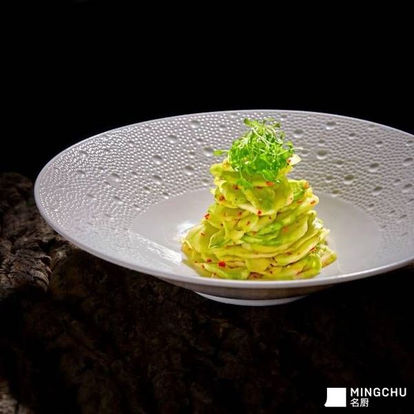 剁椒爽脆儿菜是典型的川味清口凉菜,以儿菜的清甜脆嫩为基底,搭配剁椒的鲜辣,口感层次丰富,解腻开胃。 儿菜本身带有清苦回甘,富含膳食纤维,是春季时令蔬菜,契合“尝春”的饮食理念。在传统剁椒味型基础上,加入藤椒油和白醋,增加了清新的麻香与酸香,避免了单一的咸辣。塔状摆盘精致大气,绿色主调清新亮眼,非常适合高端商务宴请或春季主题宴席,既体现食材本味,又有视觉美感。