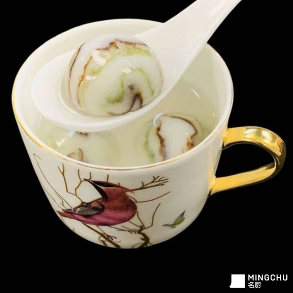 取天然雨花石之纹理意趣,以糯米为皮,揉入天然果蔬色粉,手工旋揉出层叠石纹,外皮通透如琉璃,内馅细腻温润。沸水轻煮后,汤圆浮于清汤之上,似彩石落于清泉,石纹流转,光影动人。入口软糯弹牙,内馅甜而不腻,兼具视觉美感与味觉享受,是中式甜品中的雅致之作。