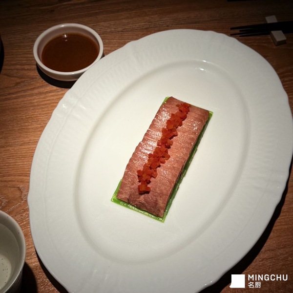1牛舌预处理选用牛舌中段,去筋膜,用盐、黑胡椒、少许米酒腌制1小时。采用62℃低温慢煮2小时,让牛舌达到「软而不散、嫩而不烂」的口感,取出后快速冰水降温,再薄切成均匀片,轻炙表面锁住香气。2窝笋片基底新鲜莴笋焯水去涩,铺底定型,提供清爽的风味支撑和色彩对比。3. 酸辣蘸汁以生抽、香醋、小米椒、蒜末、少许蜂蜜和牛骨高汤调和,熬制后过滤,做成微稠的蘸汁,既能提鲜解腻,又能增加风味层次。4. 装盘与点睛◦ 将牛舌整齐码放在莴笋片上,顶部用番茄丁或彩椒丁点缀,搭配蘸汁上桌,色彩清爽1