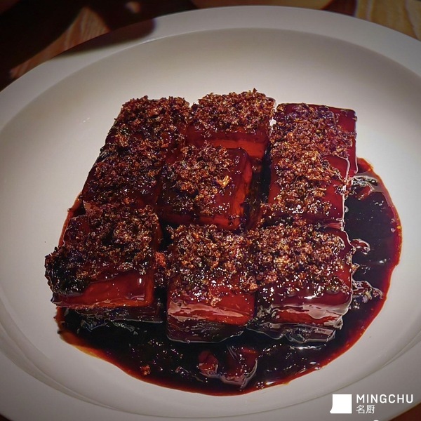 #浙菜 这道菜取材于宁波地标食材“两头乌黑猪”,但我对它进行了冷菜化的创新重构。传统干菜蒸两头乌口感油腻、风味厚重,而我的创作思路是“去油增香、冷切焕新”:首先,我选用两头乌的五花三层,通过65℃低温慢煮,让肉质软烂不散;解决了大块肉口感单一的问题。最关键的创新在于果味平衡,我加入了青苹果与红苹果,用天然果酸中和猪肉的油脂,让整道菜从“厚重”变为“清爽回甘”。最后通过冷切摆盘,呈现出如同艺术品的切面,这也是我对传统浙东风味在现代餐桌上的全新表达。