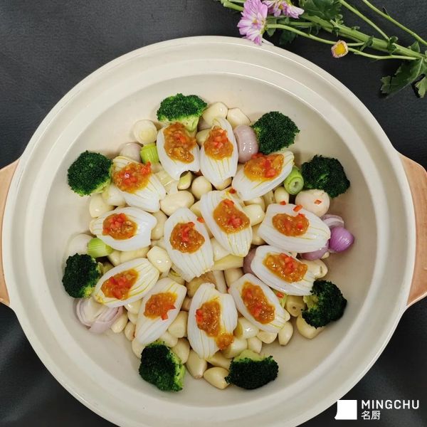金椒如贡,卷束鲜腴;砂煲慢焗,椒香入髓。一口鲜辣,尽得山海烟火气。