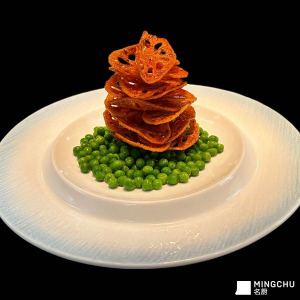 以脆炸藕片堆叠成塔,搭配清甜青豆做底,一脆一嫩、一咸香一清甜,造型精致,口感层次丰富,是兼具颜值与风味的创意冷菜/前菜。!