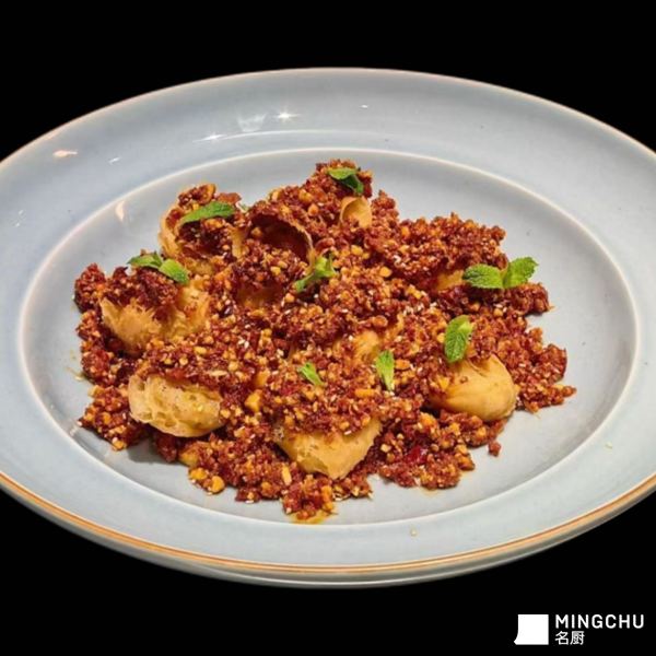 取炝锅鲈鱼热油激香之魂,融粤式脆炸之法,以鲜鲍为材,裹薄脆糊炸至金壳酥香,再以川式炝锅技法,用热油激出金蒜、干椒、花生碎的复合焦香,让脆壳锁鲜、鲍肉弹嫩,蒜香、椒香、坚果香层层递进,一口解锁外酥里嫩、鲜辣交织的高阶口感,是融合菜系中兼具烟火气与仪式感的招牌硬菜。