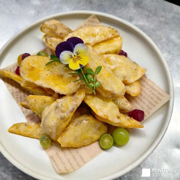 薯角油炸后,用黄油咸蛋黄炒翻沙,香味浓郁