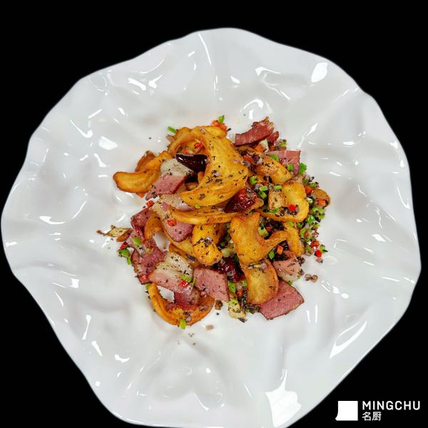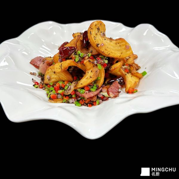 搭配青城山地道风干腊肉,腊香醇厚咸香,融入梅干菜独特陈香,辅以青红椒、洋葱粒爆炒激发出复合小香辣底味。腊肉油润脂香与土豆清甜薯香完美交融,外酥里糯的翘翘薯吸饱腊香锅气,咸鲜微辣、层次饱满。