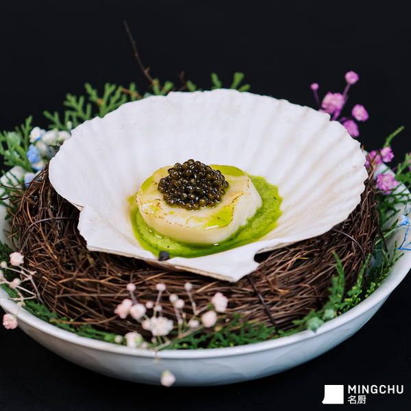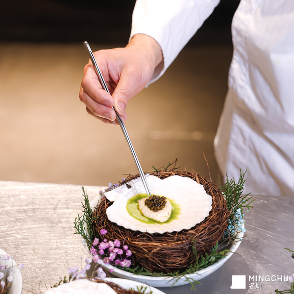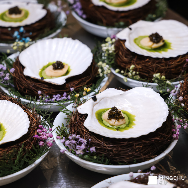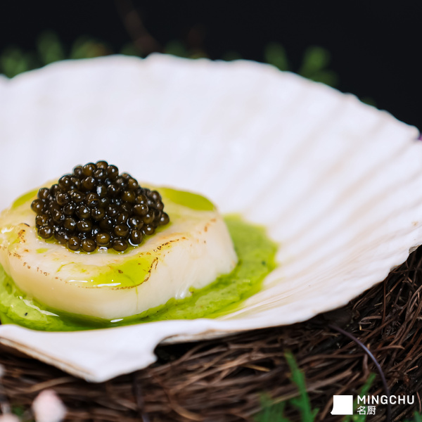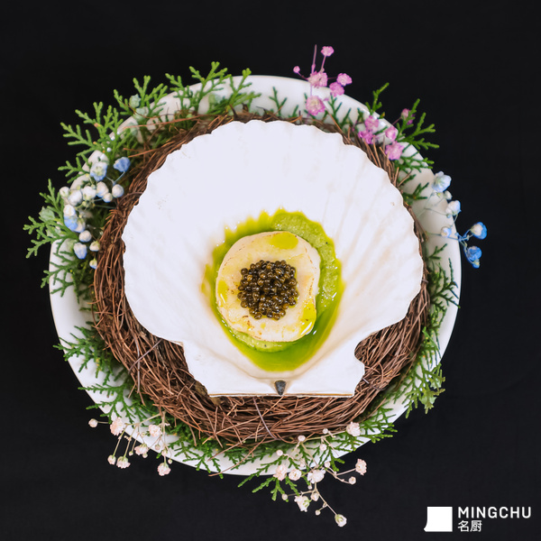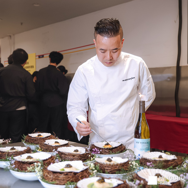 2026 沪苏浙米其林指南餐厅庆典晚宴现场,特邀成都米其林一星餐厅银锅餐厅主厨 毛小军 带来《翡翠青酱俄罗斯大扇贝》。