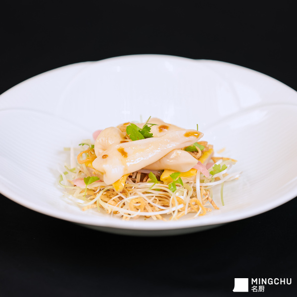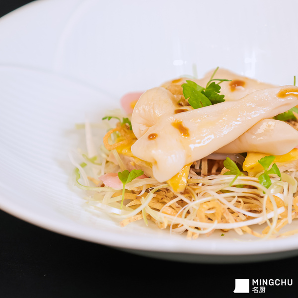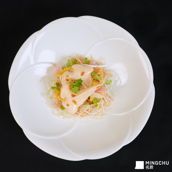 2026 沪苏浙米其林指南餐厅庆典晚宴现场,特邀福建省米其林一星餐厅宴遇餐厅主厨 陈惠民 带来《嫩姜河田鸡捞拌漳港蚌》。