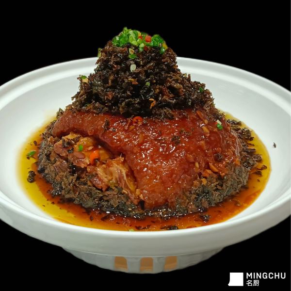 以经典梅菜扣肉为基底,升级选用整只猪肘替代五花肉,经炸制形成虎皮纹理,搭配吸饱肉香的梅干菜蒸制,打造宴席级硬菜,皮糯肉烂、肥而不腻,咸香浓郁。