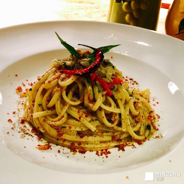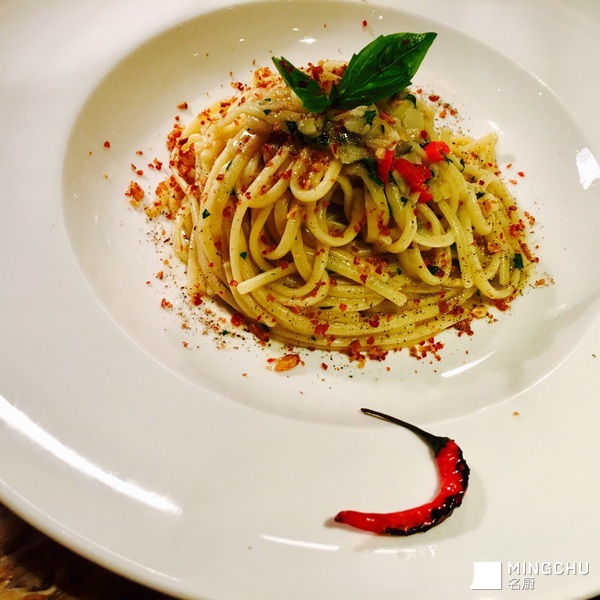 蒜香辣味橄榄油意面,配风干圣丹尼火腿碎。