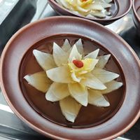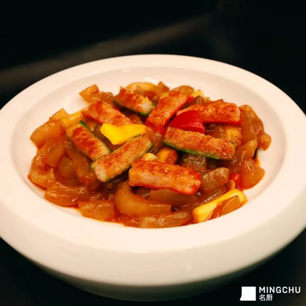 味型:鲜辣清麻不压参香,鲜椒现炒提鲜,百花馅增嫩弹,口感层次鲜明。技法:黄玉参煨透入味,百花酿馅锁汁,鲜椒收汁亮油,软糯与脆嫩兼具。呈现:翠绿鲜椒配玉参润黄,摆盘雅致,高端商务与宴席皆宜。