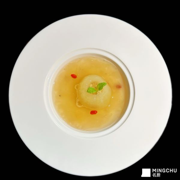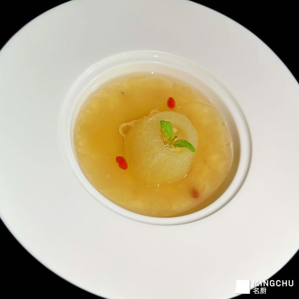 精选小香梨手工去核,肉质细腻无渣;搭配晶莹桃胶与雪耳细致去蒂,文火慢煨慢炖,凝萃天然温润胶质。梨肉煨至通透绵密,入口清甜化渣,桃胶 Q 弹软糯,银耳丝滑。汤品温润,点缀宁夏枸杞与鲜萃薄荷叶,摆盘素雅,尽显东方饮食美学。