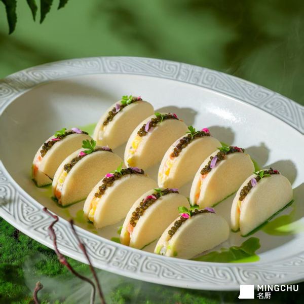 以春日嫩甜笋为本味基底,突出食材本身清甜脆嫩;搭配高端鱼子酱,三文鱼。做到「山林清甜深海鲜味」两极风味碰撞,笋的清爽中和三文鱼的油脂,咸甜平衡,低脂轻盈,口感脆嫩爆珠,是春夏季节清润高级的轻食冷前菜。