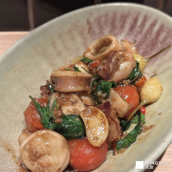【菜品特点】色泽红亮诱人,鱿鱼卷曲饱满,酱汁浓郁裹附均匀,酸辣蒜香扑鼻。入口鲜嫩弹牙,辣而不燥,蒜香提神,泡椒开胃解腻,香菜葱花增添清新尾韵。适合佐酒或下饭,是一道兼具风味与美感的热炒佳肴。