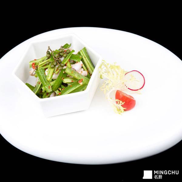 山与海的邂逅这道“云岭鲜萃”,是一场关于味觉的地理跨越。我们将深海的馈赠——脆嫩八爪鱼,带入了云南的高原秘境。灵魂在于那抹独特的绿意——大香菜。它学名Eryngium foetidum(刺芫荽),是热带雨林中极具辨识度的香料。其叶片边缘如锯齿般锋利,却蕴含着比普通香菜更为浓郁、霸道且持久的异香。当大香菜的浓烈遇上青花椒的鲜麻,再包裹住八爪鱼的 Q 弹,入口瞬间,仿佛置身于雨后清新的云南山林,鲜、麻、香在舌尖层层绽放,是一道极具记忆点的开胃前菜。