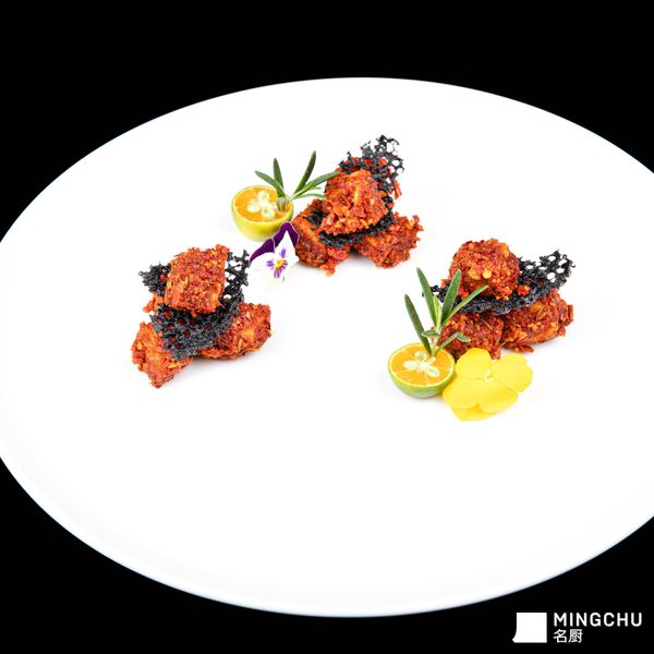 摆盘上,黑色的脆片如同抽象的艺术笔触,与橙红色的肉块形成强烈的视觉对比。这不仅是味觉的享受,更是视觉的盛宴。适合搭配一杯清爽的白葡萄酒或冰镇乌龙茶,让怪味的层次在舌尖尽情绽放。