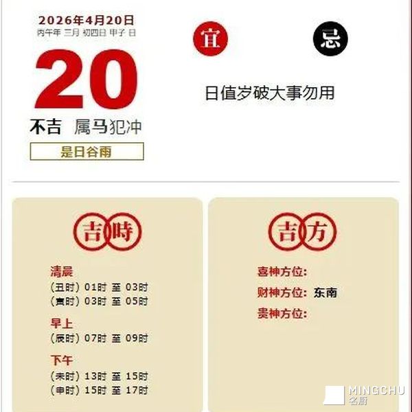 4月20日 谷雨节气。宜祭祀祈福 分家产 亲民 契约 安床 治病 纳畜 纳财 检修 防护 经络 忌修灶 动用储备 占卜。鼠宜信心,牛利见大人,虎忌投机,兔宜稳进,飞龙在天,蛇宜同舟共济,马宜勿感情用事,羊宜慎言行,猴利广结善缘,鸡宜耐心,狗事业运佳,猪宜果断。范围天地之化而不过,曲成万物而不遗,通乎昼夜之道而知,故神无方而《易》无体一一风水智语
