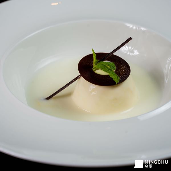 本道甜品以希腊式原味酸奶为基底,融合淡奶油与吉利丁凝冻成型,打造出如云朵般绵密顺滑的口感。酸奶的天然乳酸带来清爽酸甜,中和了奶油的醇厚,入口即化,余味悠长。顶部以手工巧克力脆片做立体造型,增添酥脆层次与可可香气,薄荷叶点缀其间,提亮视觉与风味。盘底淋入自制酸奶酱,让每一口都能尝到绵密冻体与丝滑酱汁的交融。整道甜品低脂轻负担,酸甜平衡,既保留了酸奶的健康属性,又兼具法式甜品的精致美学,是餐后解腻、唤醒味蕾的绝佳选择,适配高端宴席与精致下午茶场景。