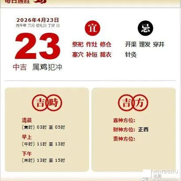 4月23日。宜祭祀祈福 出行 定制 上梁 修灶 解除 求子 闭关 造畜栏 关怀孕妇 节约用水 防虫 忌理发。鼠利积极,牛宜心平气和,虎利广结善缘,兔柳暗花明,龙宜认真勿疏忽,蛇宜精进,马宜谦虚有礼,羊顺,猴易稳重,鸡宜深思熟虑,狗顺中有阻,猪利交际。子曰:不教而杀谓之虐;不戒视成谓之暴;慢令致期谓之贼;犹之与人也,出纳之吝谓之有司一一风水智语