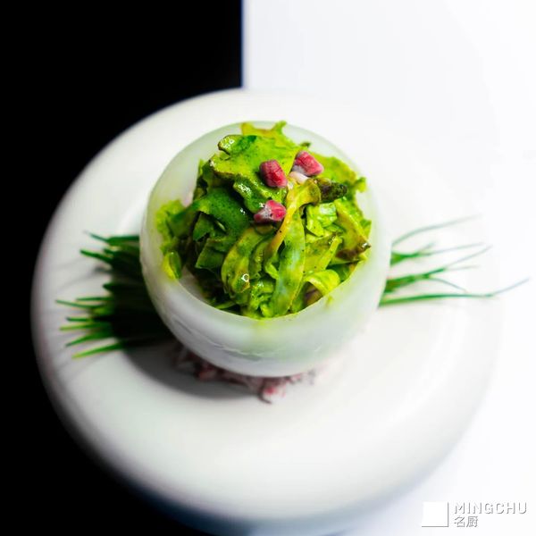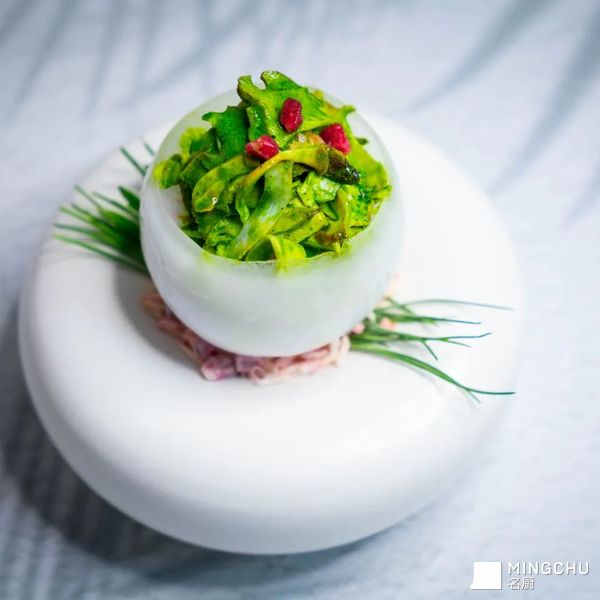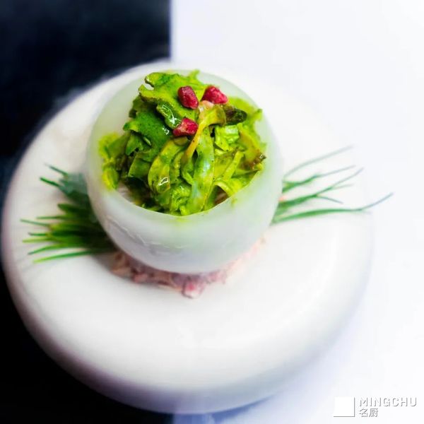 灵感取自深海寒波、碧波凝玉、沧海琉璃。大海潮起雾涌,海面清冽泛翠,深海螺肉莹润剔透,以寒冰为盏、碧汁裹鲜,将山海清冷意境融于一道冷菜,清冷高级、仙气氛围感拉满。
