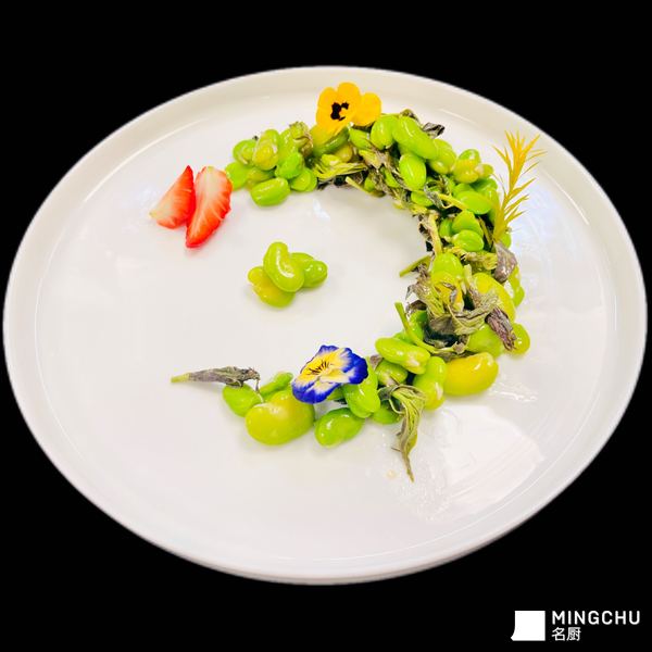 这是一道极具季节仪式感的“春日双鲜”料理。盘中翠绿饱满的蚕豆与紫红嫩绿的香椿芽交织,点缀以食用三色堇与鲜红草莓,将春天的色彩与风味浓缩于纯白瓷盘之上,呈现出咸鲜清爽、软糯清香的味觉体验。