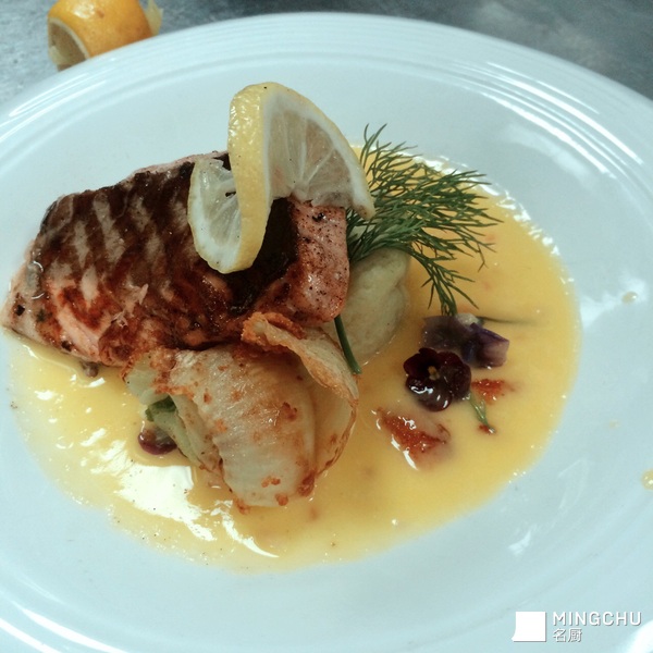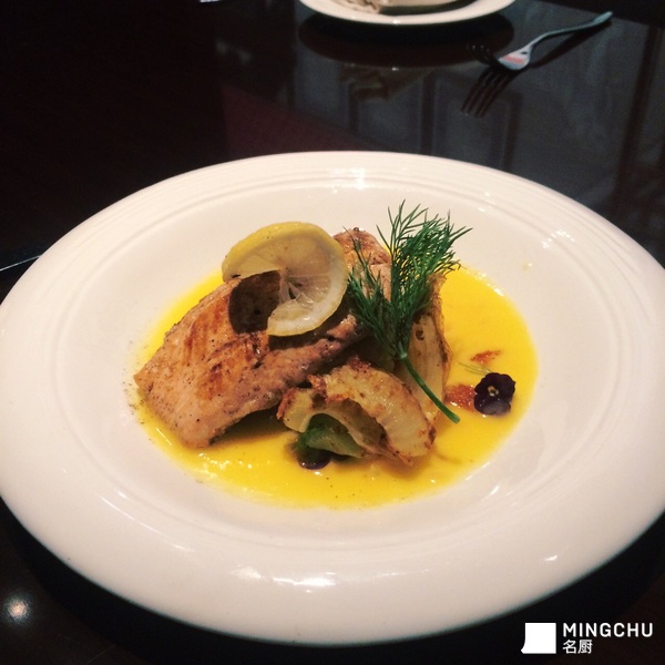 低温三文鱼与铁扒配柠檬香草黄油汁蒜香茴香头