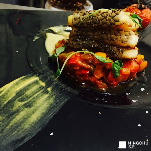 香煎鳕鱼配蔬菜酱和白酒奶油生蚝汁