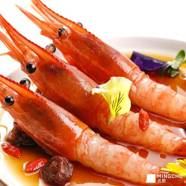 这道菜中的辅料话梅,其一以清香酸甜口感使酒香更醇美,甜虾更显鲜弹,其二话梅绯红的色泽能为整道菜肴的摆盘增色。撒上干桂花和云南小红花,鲜红色泽的牡丹虾与甜汁交融,新颖别致。