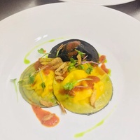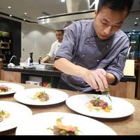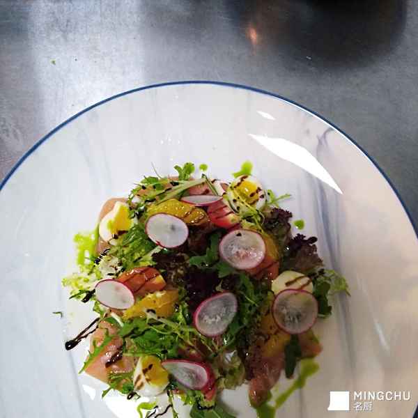 烟熏三文鱼薄片沙拉配橙肉糖心鹌鹑蛋