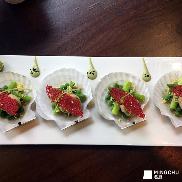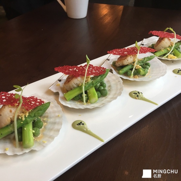 煎扇贝五香琥珀蛋芦笋姜味清酒汁