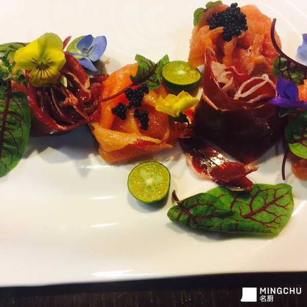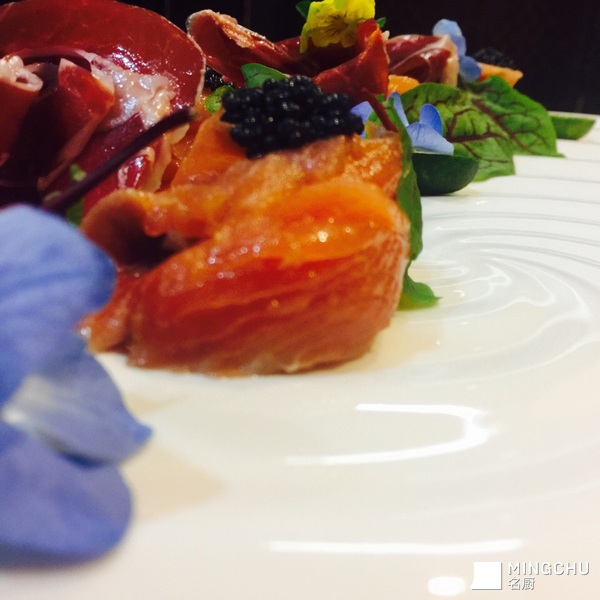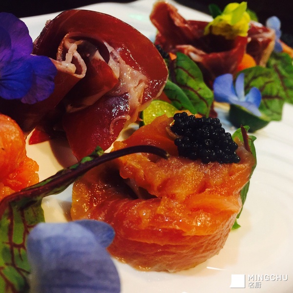 青柠玫瑰海盐三文鱼配火腿黑鱼子酱