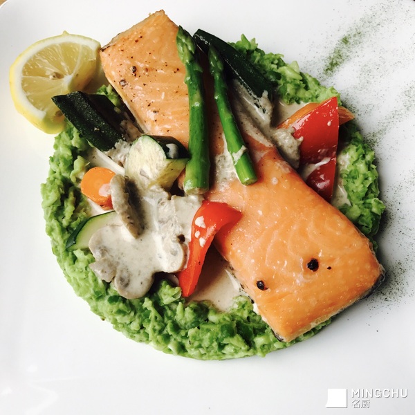 低温慢煮三文鱼 蘑菇酱 青甜豆泥