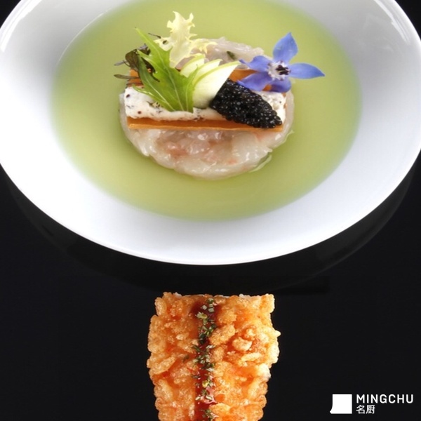 鲜虾带子塔塔芦笋清汤佐天妇罗大虾