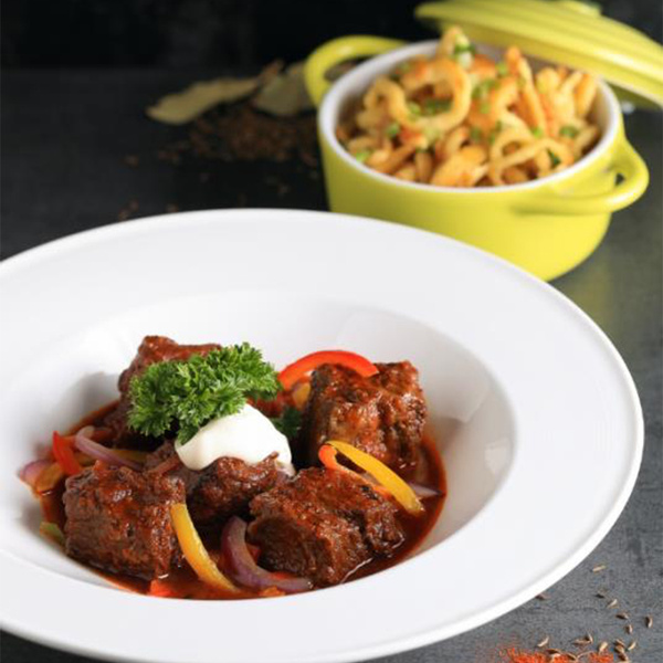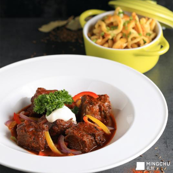 德国经典的黄油面根(Spaetzle)搭配炖好的牛肉,面根爽弹的口感加上浸透了酱汁的牛肉,再来一杯德国啤酒,完美!