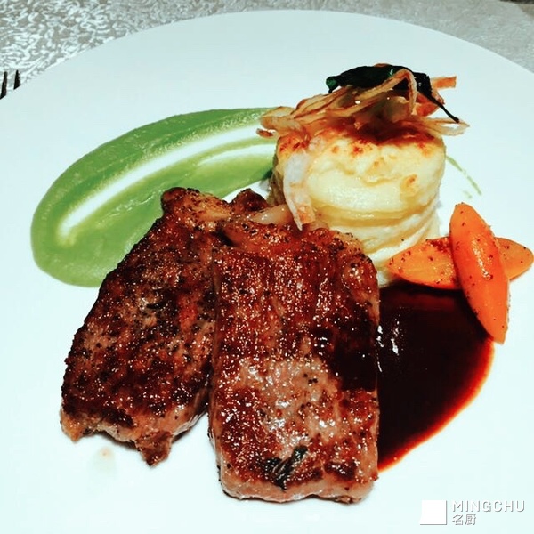 雪花牛扒配豌豆泥千层土豆红酒汁