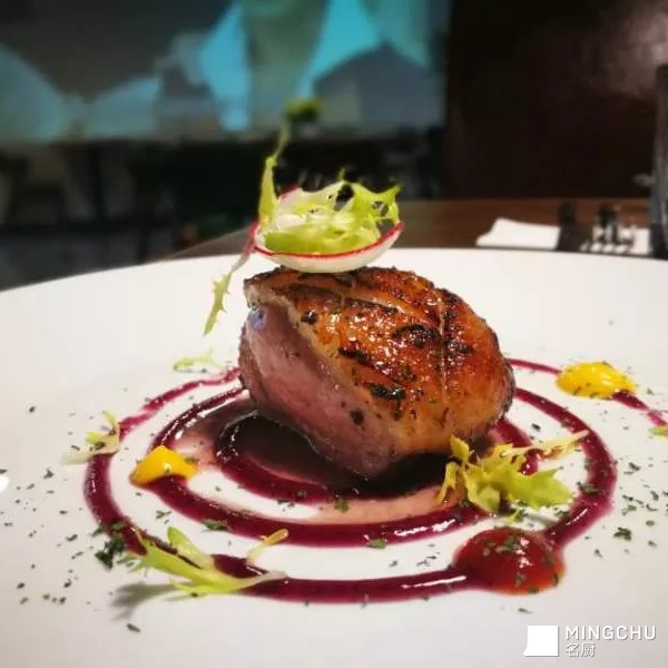 鸭胸肉煎上颜色,搭配水果味树莓酱出品装饰既可,